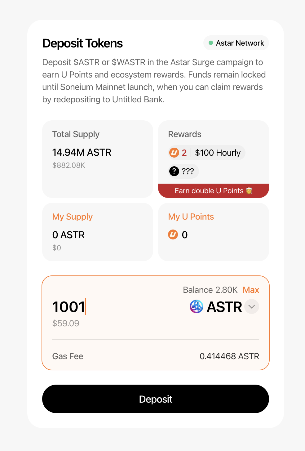 Deposit $ASTR or $WASTR in the Astar Surge campaign to earn U Points and ecosystem rewards. Funds remain locked until Soneium Mainnet launch, when you can claim rewards by redepositing to Untitled Bank.