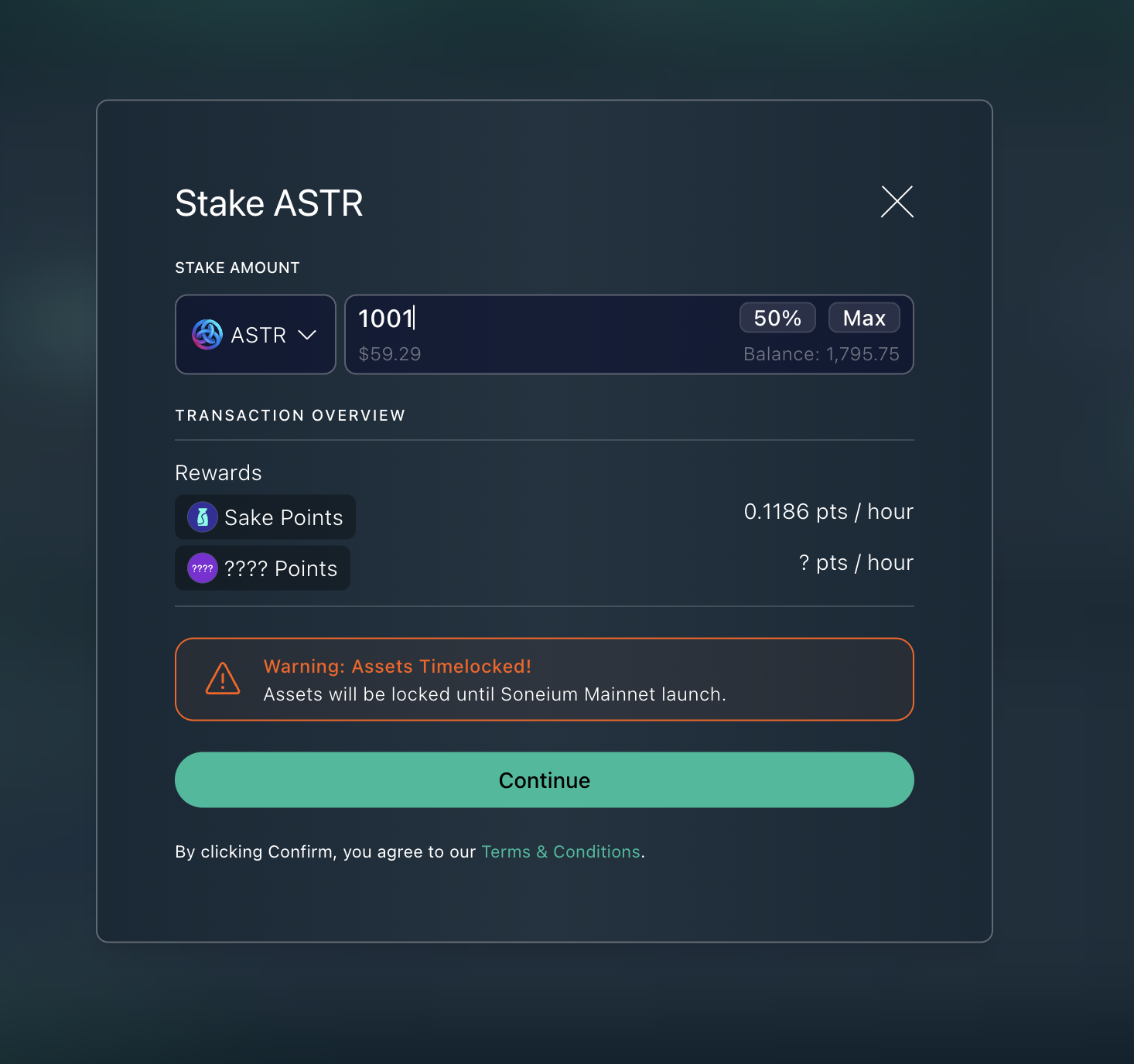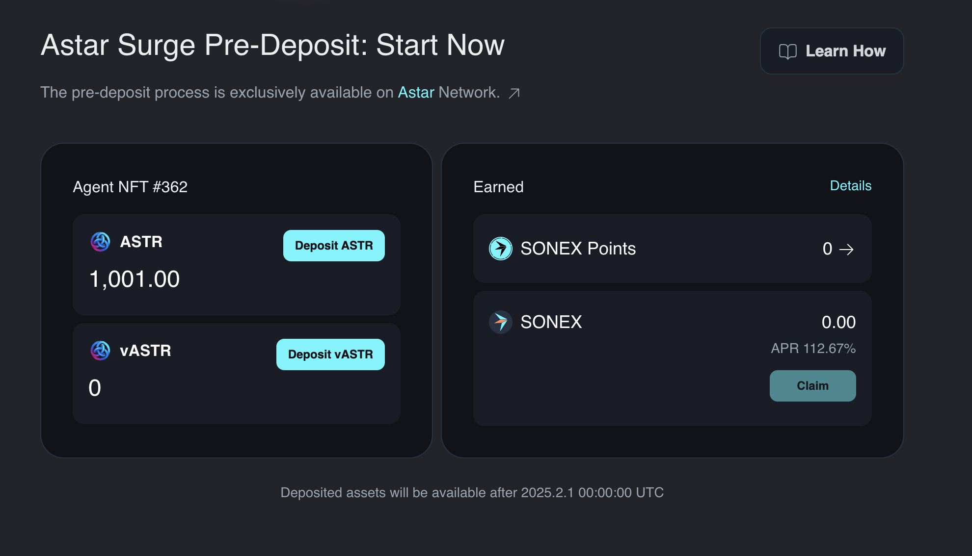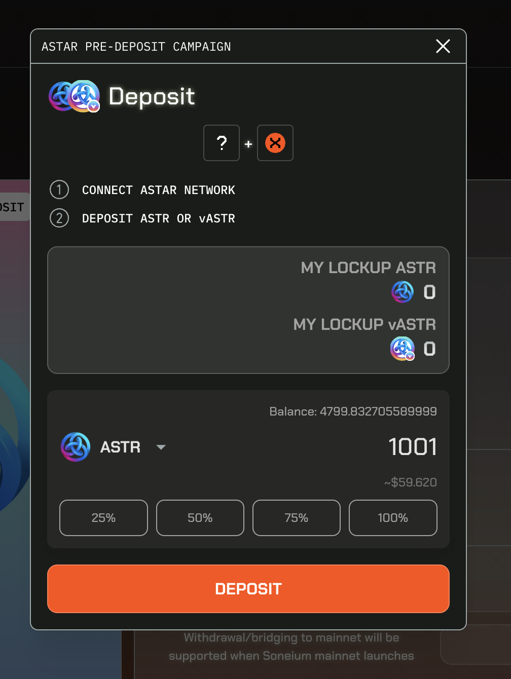 ๐Ÿ‘‰ Purpose: The Astar Surge Pre-Deposit Campaign offers ASTR holders the chance to deposit their tokens into dedicated contracts on Astar Network. In return, participants earn points for each participating Soneium dApp.