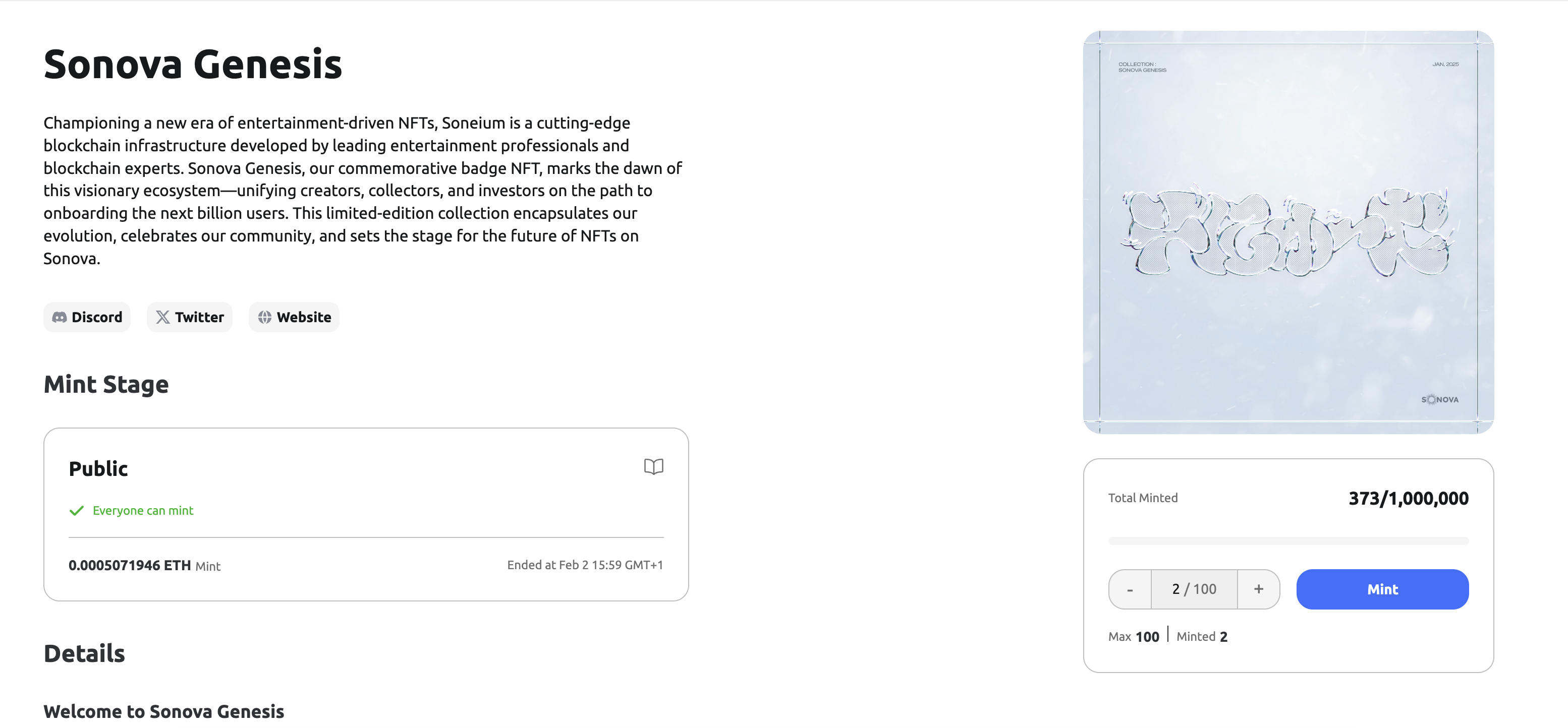 Sonova Genesis is the first commorative NFT collection on Soneium. Sonova will serve as the central hub for a wide range of NFT collections on the Soneium blockchain. With numerous collections planned for future sales, this commemorative NFT represents the beginning of an exciting series of projects.