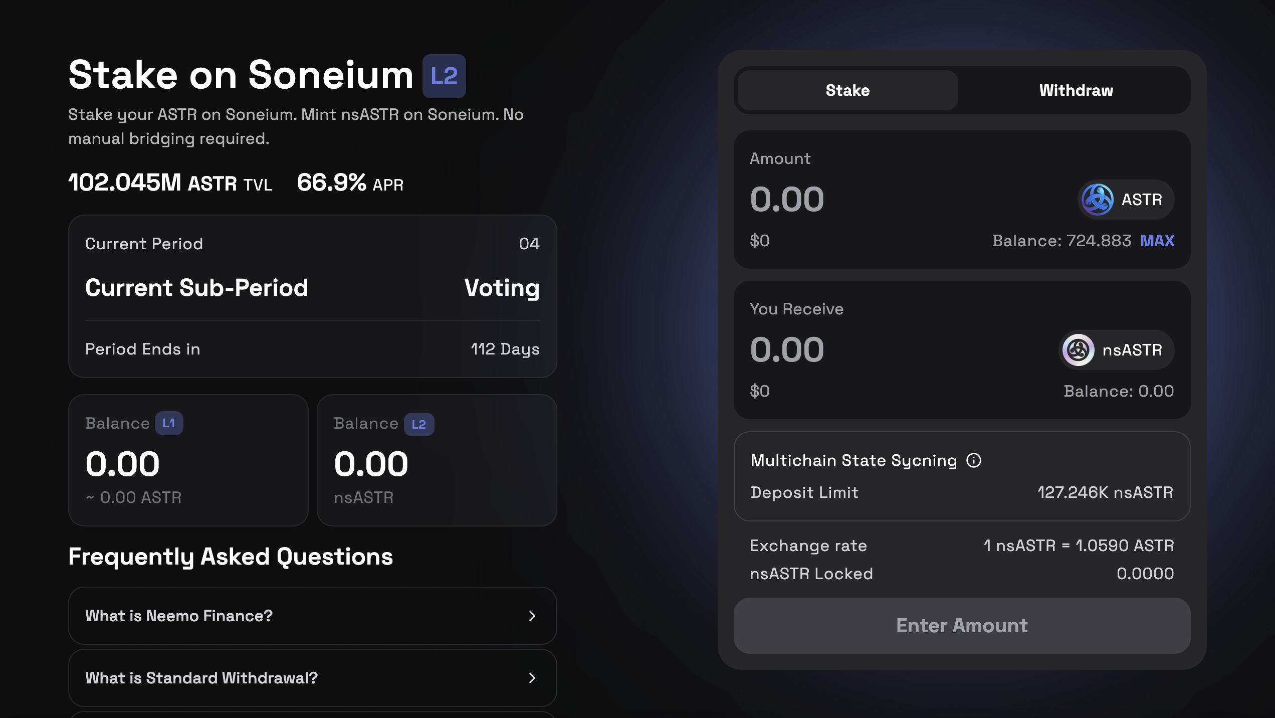 Visit Neemo Finance ๐Ÿ”— Open and enter amount of ASTR to stake