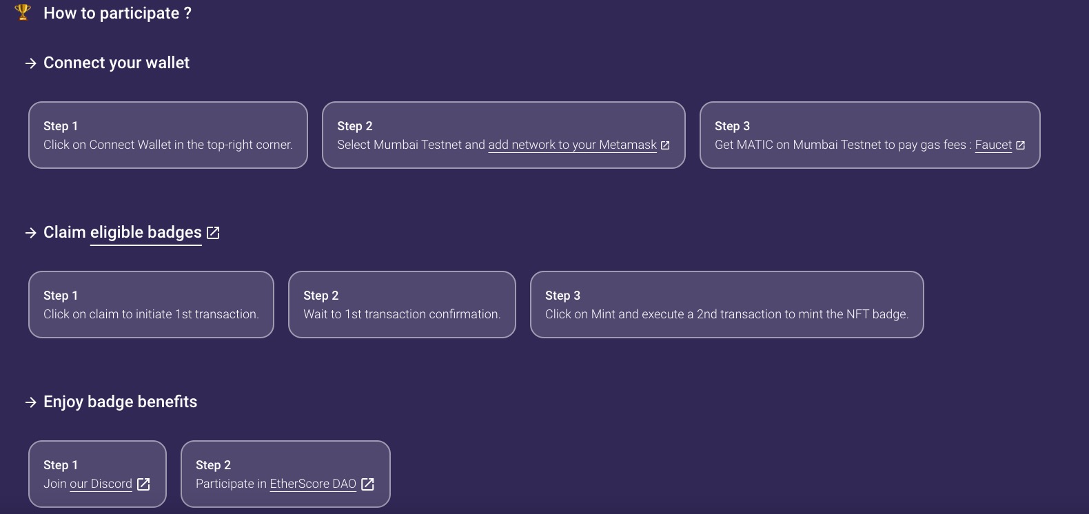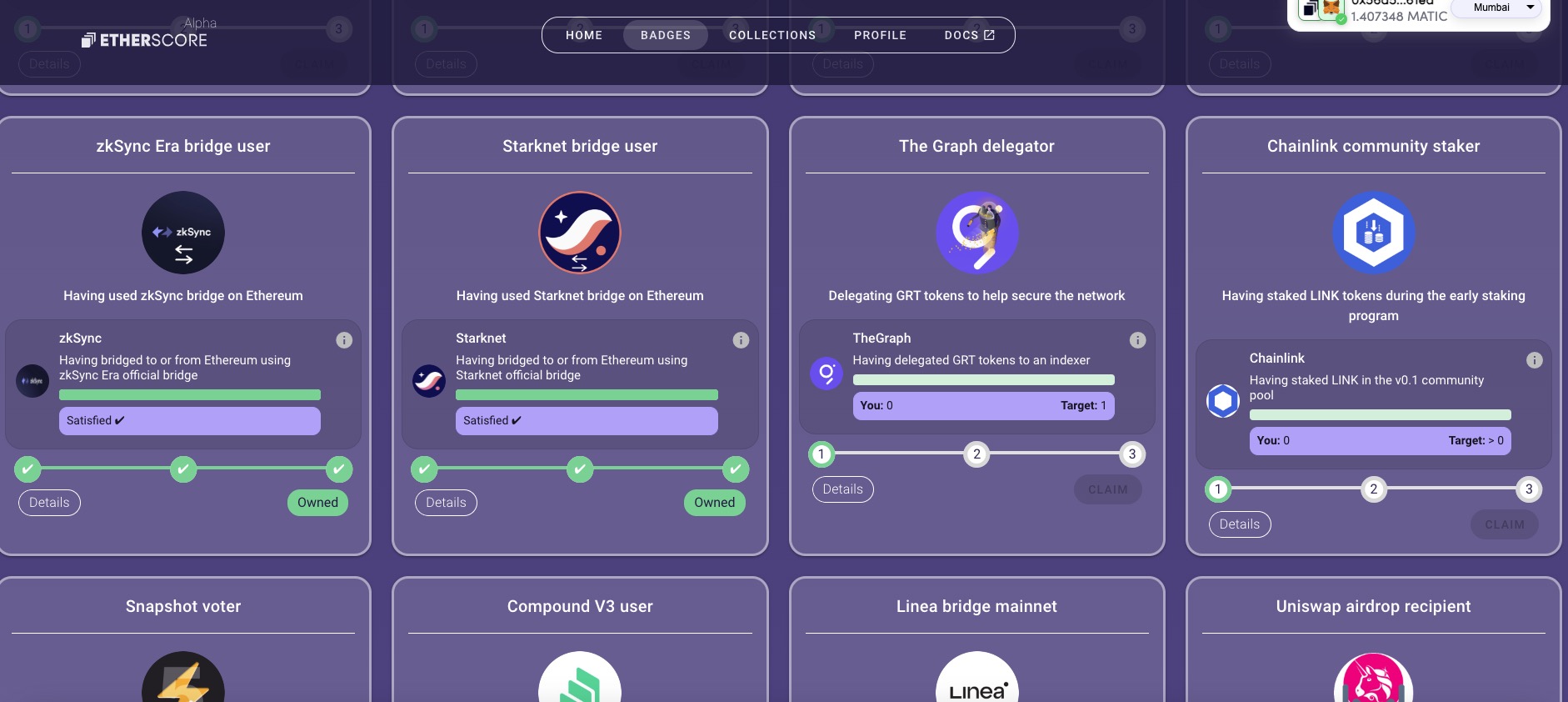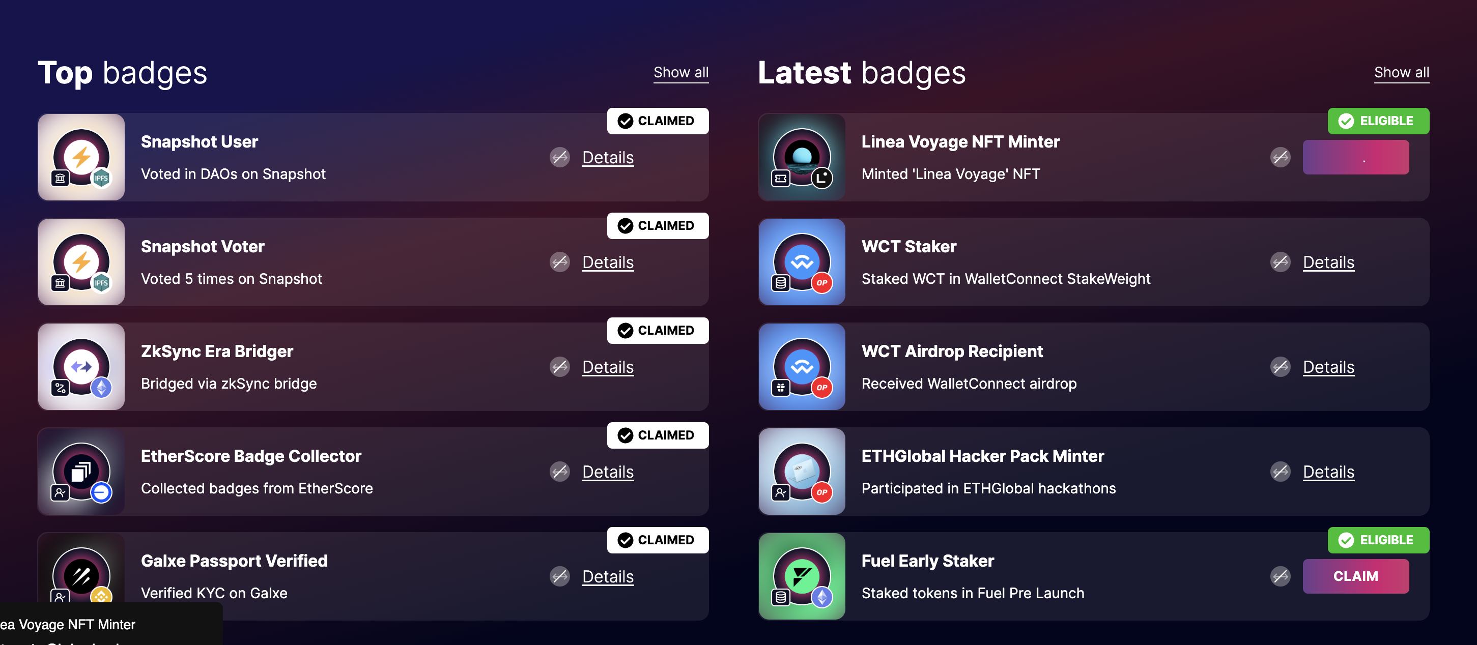Explore all available badges for minting and take the necessary steps to qualify for new ones.