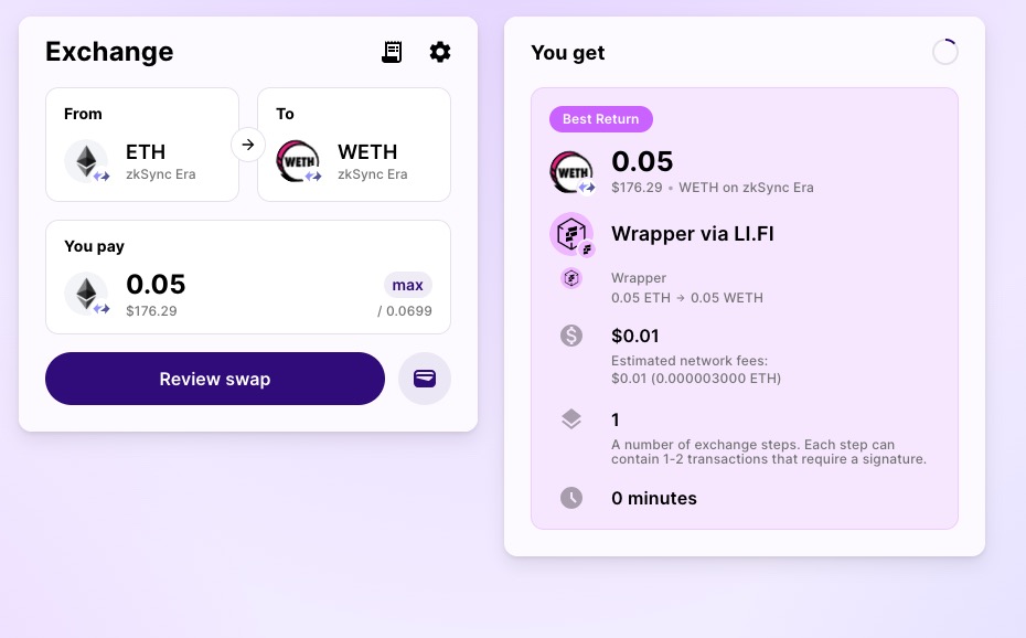 I used Jumper Exchange 🔗 Open to Transfer some funds to zkSync from Arbitrum and I swap from ETH to WETH