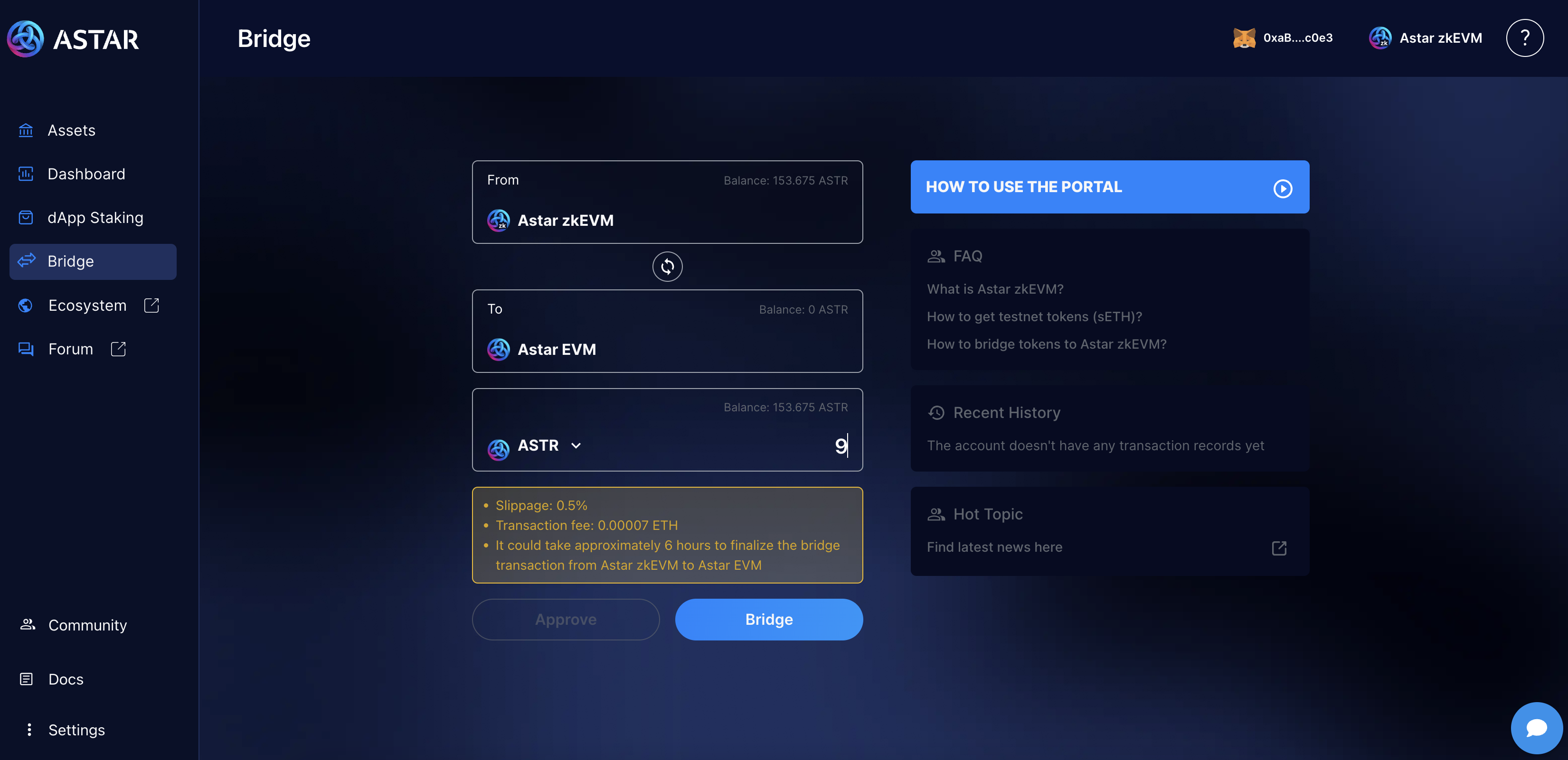 Connect your wallet and select the amount of ASTR to transfer to Astar EVM
