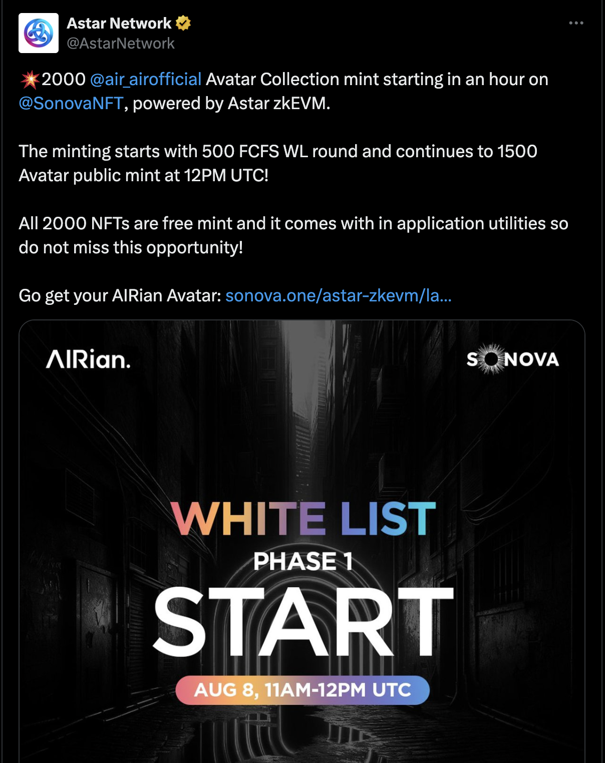 Purchase NFTs on Astar zkEVM Blockchain on Sonova 🔗 Open