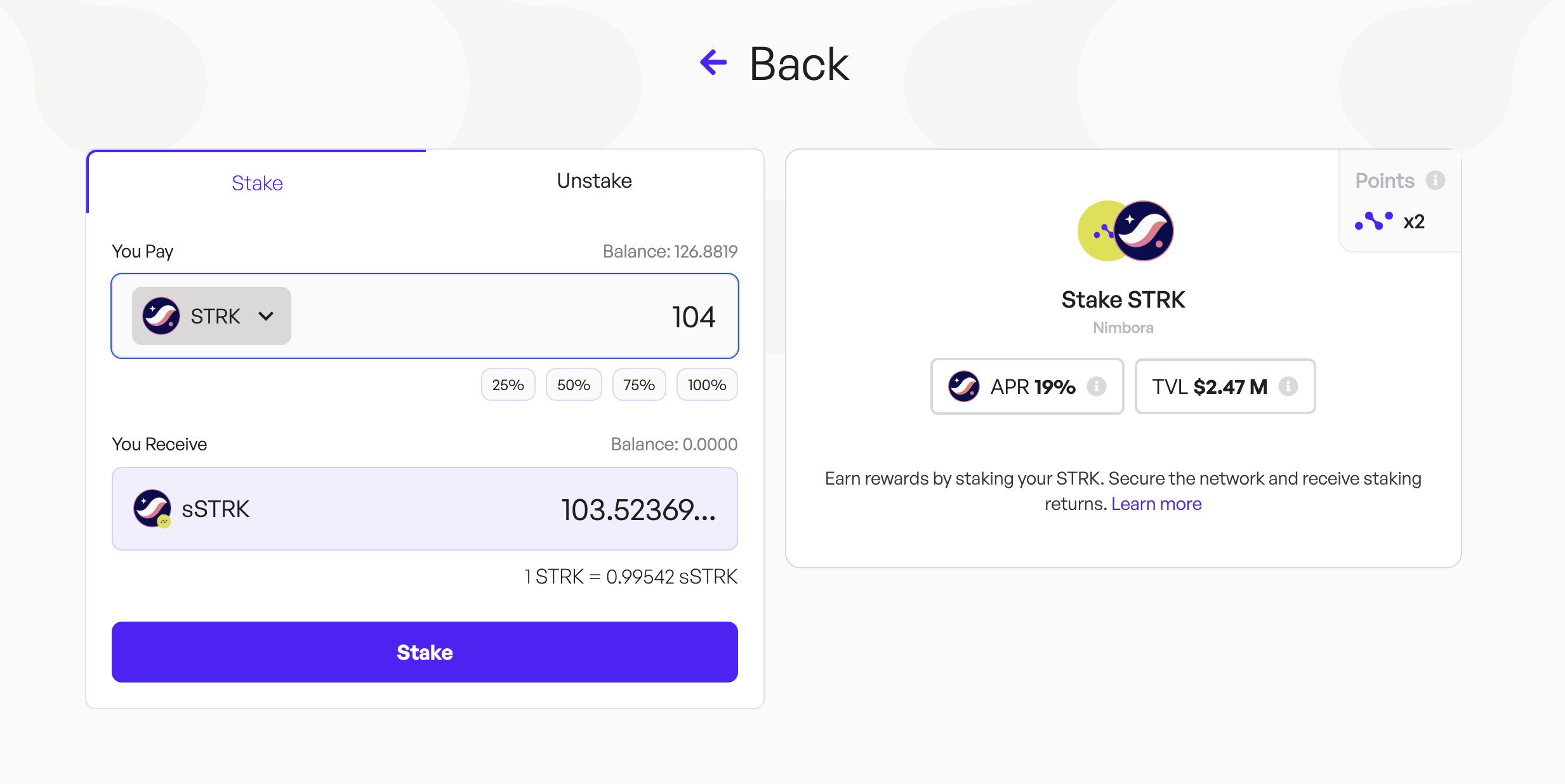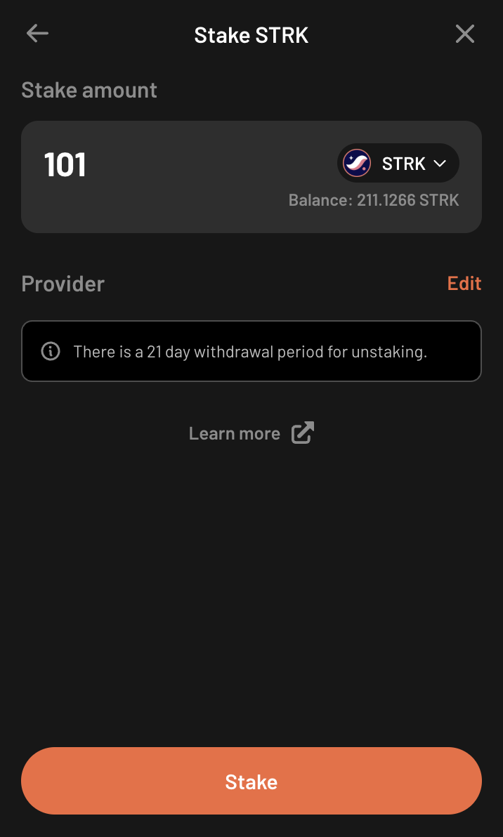 Earn rewards by staking your STRK. Secure the network and receive staking returns. Learn more 🔗 Open