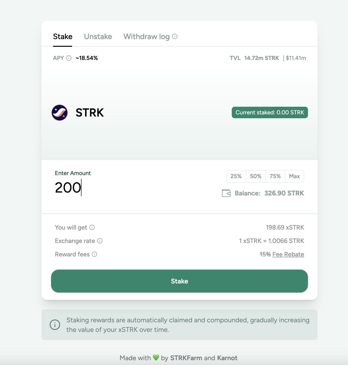 Staking rewards are automatically claimed and compounded, gradually increasing the value of your xSTRK over time.