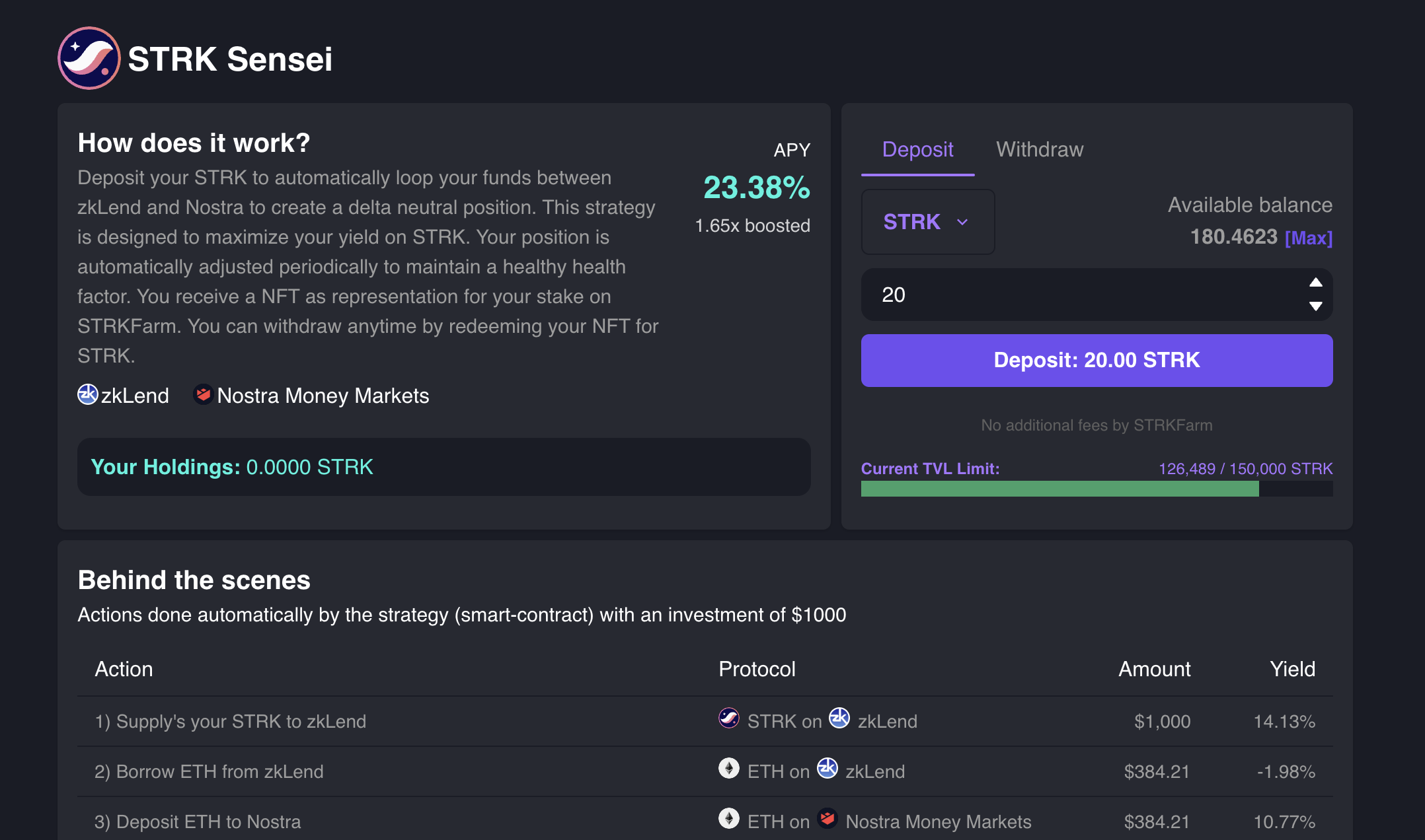 Deposit your STRK to automatically loop your funds between zkLend and Nostra to create a delta neutral position. This strategy is designed to maximize your yield on STRK. Your position is automatically adjusted periodically to maintain a healthy health factor. You receive a NFT as representation for your stake on STRKFarm. You can withdraw anytime by redeeming your NFT for STRK.