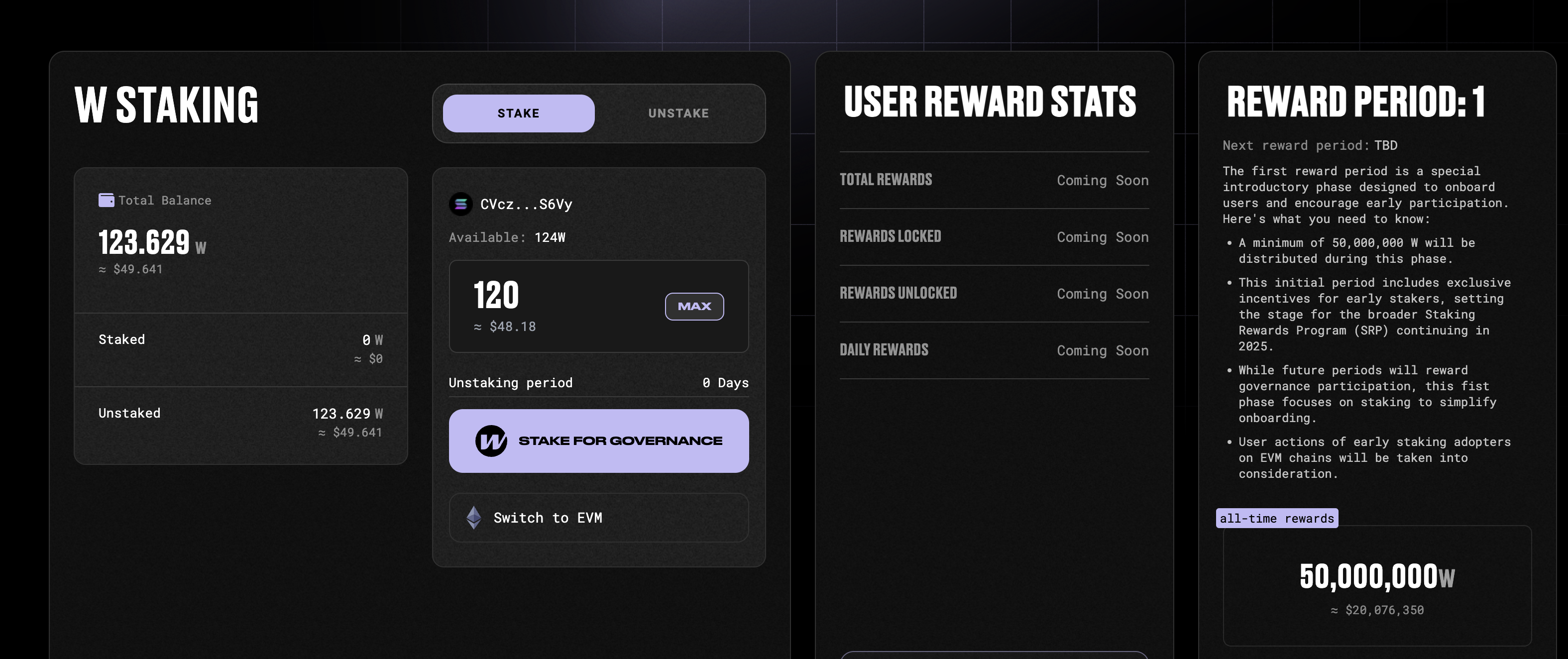 If you have your W on Solana, you need to transfer them to EVM blockchain such as Base, Ethereum, Arbitrum or Optimism.